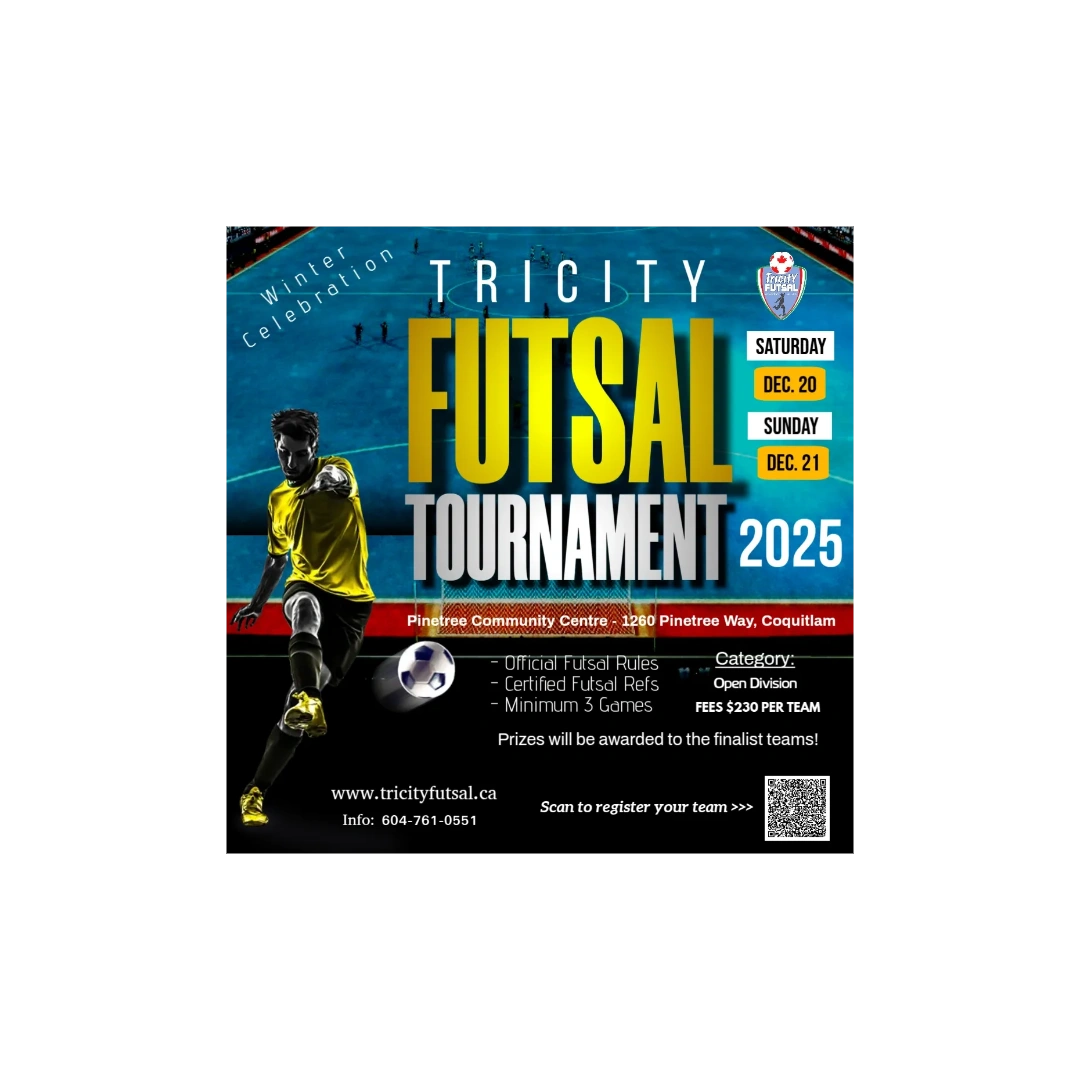 Winter Celebration Tricity Futsal Tournament 2025 - Join the action at Pinetree Community Centre, Coquitlam on December 20 & 21 Open divisions for adults. Prizes for top teams! Scan the QR code on the poster to register your team or at link below: